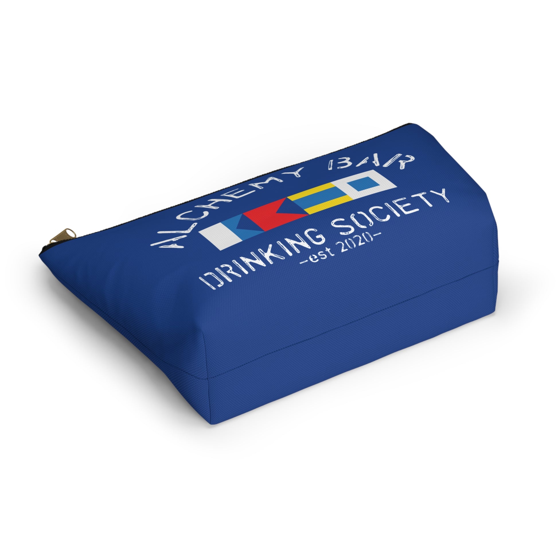A compact accessory pouch crafted for nights out at the bar or relaxed weekends with friends. The tapered T-bottom shape gives it stability on counters while the bold blue canvas hosts a distressed “Alchemy Bar Drinking Society” emblem — a nod to lively rituals, shared toasts, and inside-joke clubs. The gold zipper pull adds a warm, vintage touch while the laminated interior protects against spills and keeps contents tidy. Toss in cards, cash, earphones, or a small flask and carry a little club spirit wherever you wander.